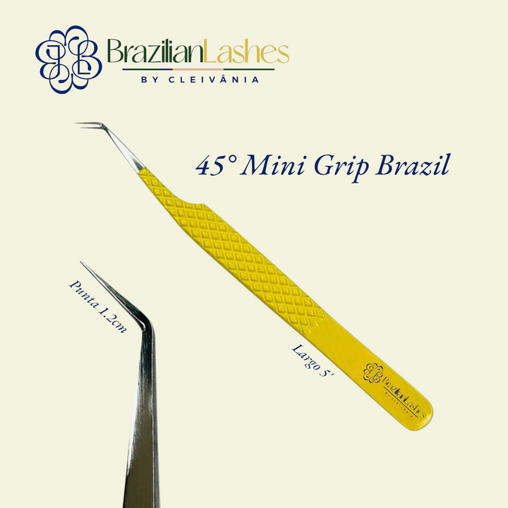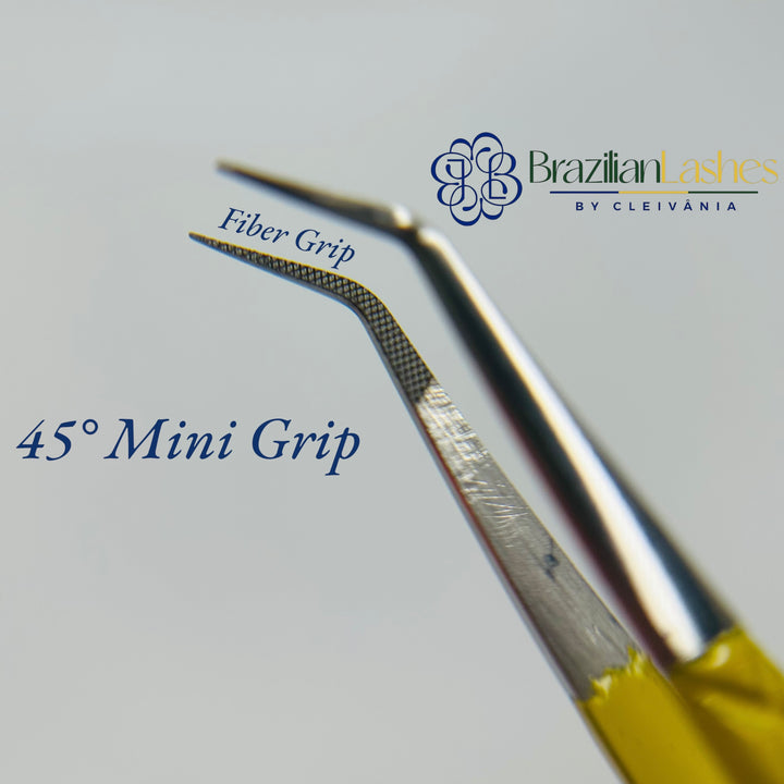 45° Mini Grip - Pinza con ángulo 45 grados con punta fina y alargada posee agarre de fibra antideslizante ¨Fiber Grip¨. Adecuada para trabajar todo tipo de extensiones de pestañas, como volumen artesanal, clásicas e fibras tecnológicas. También pueden ser utilizadas para el aislamiento de pestañas naturales. Posee "Diamond Cut" en el exterior para mejor agarre de la mano.