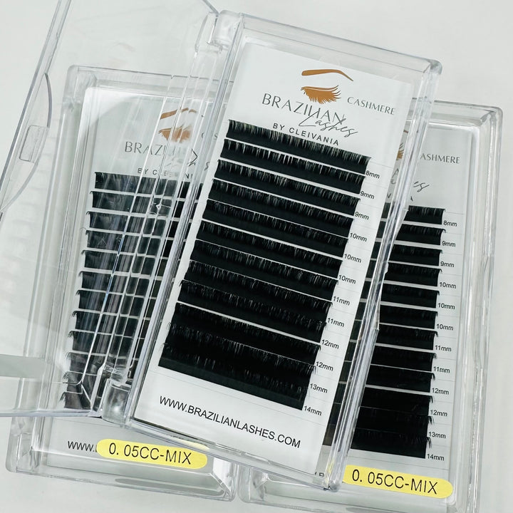 Fibras CASHMERE, para la Técnica de Mega Volumen. Extensiones de pestañas en color negro. Ideales para trabajar la técnica "Pinch" y abanicos artesanales. Curva: D/CC Grosor: 0.05 Largo: Mix 8mm-14mm Tiras:...